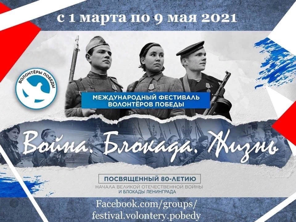 С 1 марта по 9 мая 2021 года пройдет международный онлайн — фестиваль Волонтеров Победы «Война. Блокада. Жизнь.», посвященный 80-летию начала Великой Отечественной войны и блокады Ленинграда.