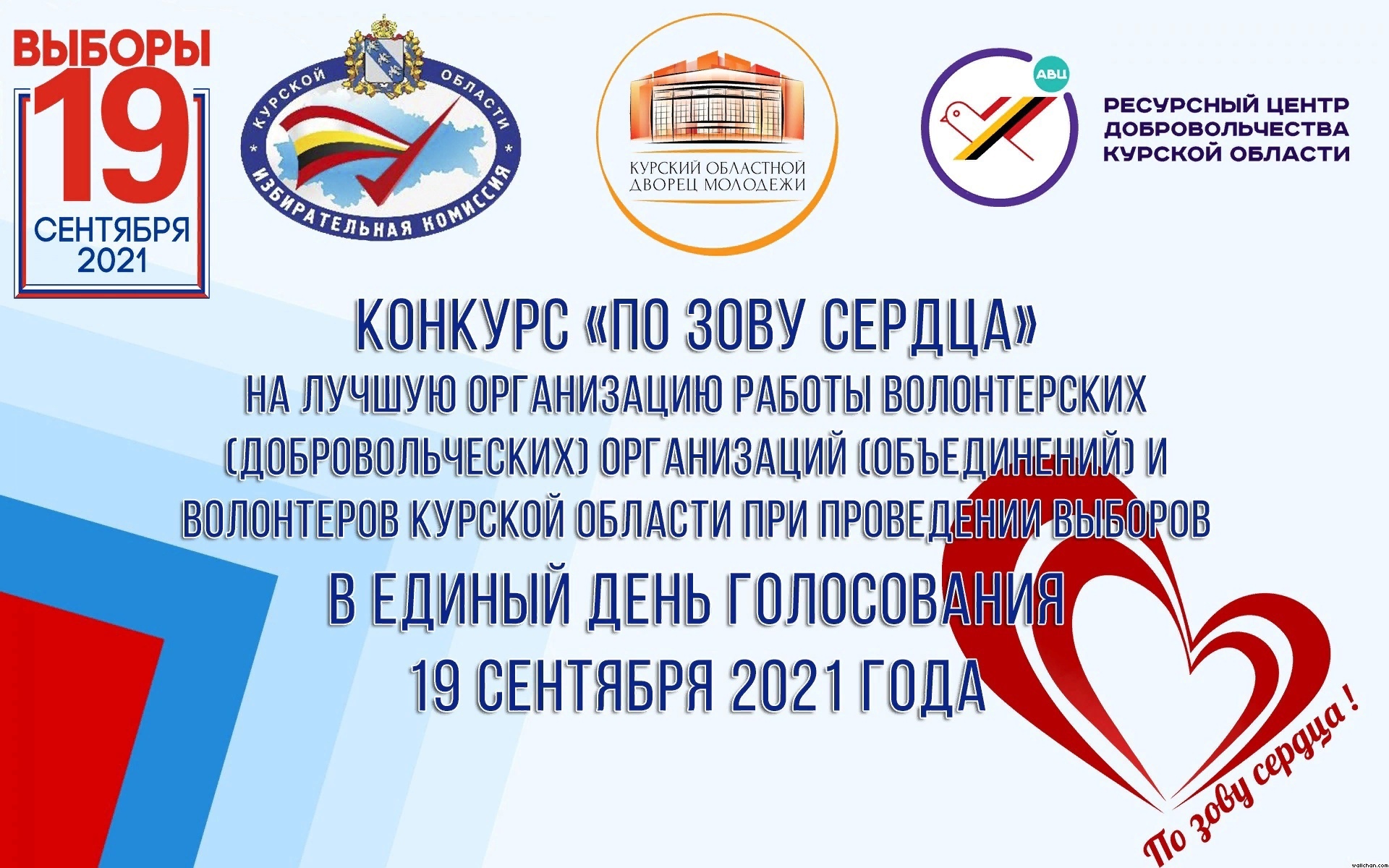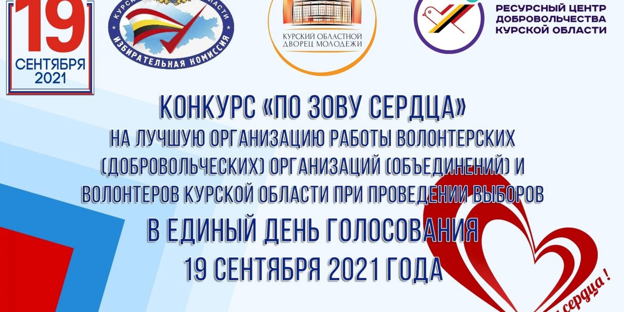 Избирательная комиссия Курской области совместно с Областным Дворцом молодежи и Ресурсным центром добровольчества Курской области проводят конкурс «По зову сердца» на лучшую организацию работы волонтерских (добровольческих) организаций (объединений) и волонтеров Курской области при проведении выборов в единый день голосования 19 сентября 2021 года.