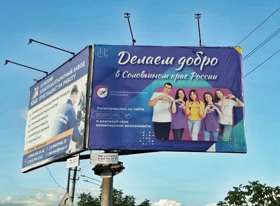 Еще одним аспектом рекламной кампании Ресурсного центра добровольчества являются баннеры и билборды, расположенные на всей территории региона и города.