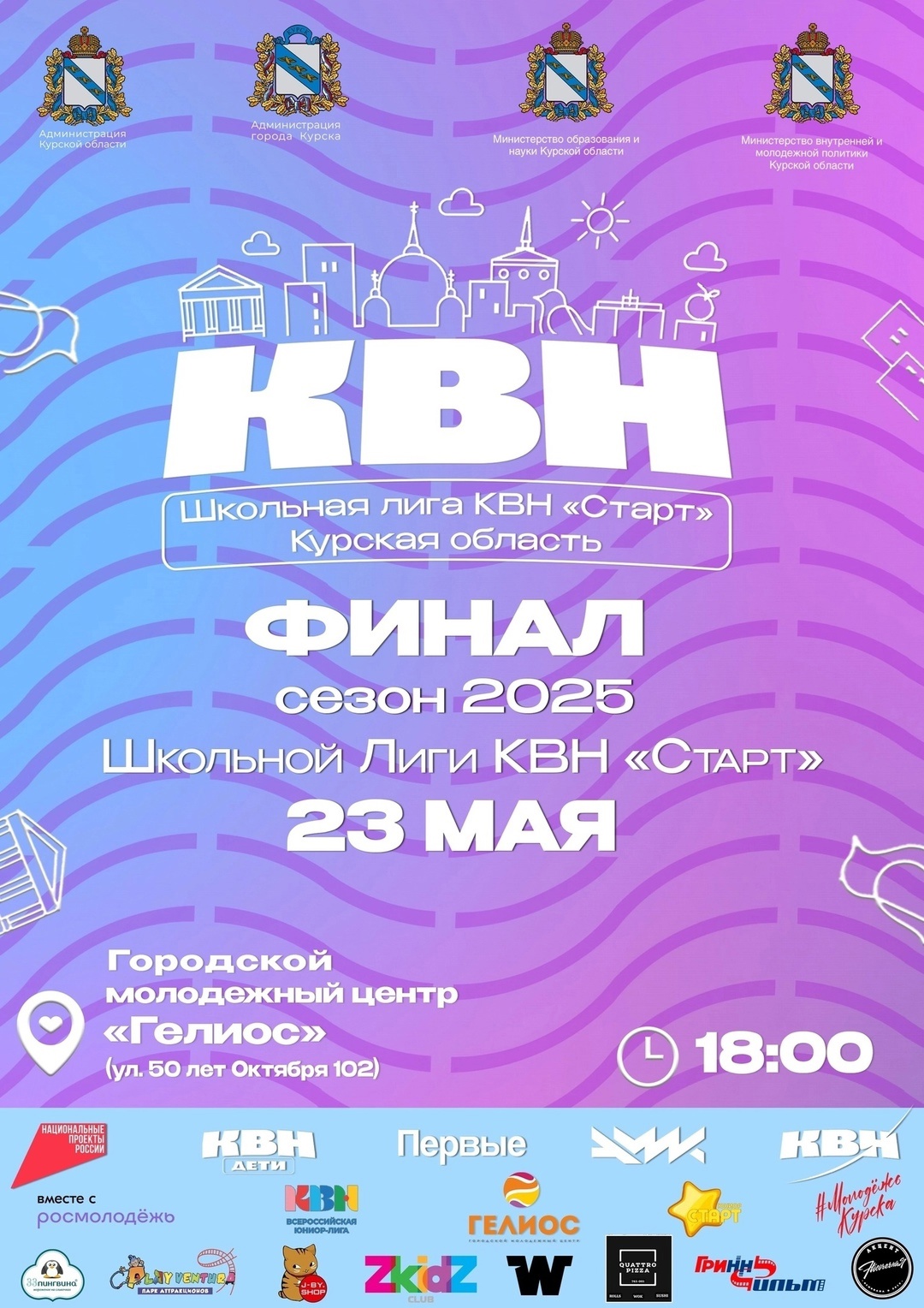 23 мая на сцену Городского молодёжного центра «Гелиос» выйдут 10 лучших детских, школьных команд КВН города Курска и Курской области, которым удалось пройти сложный путь в сезоне и оказаться в Финале !
