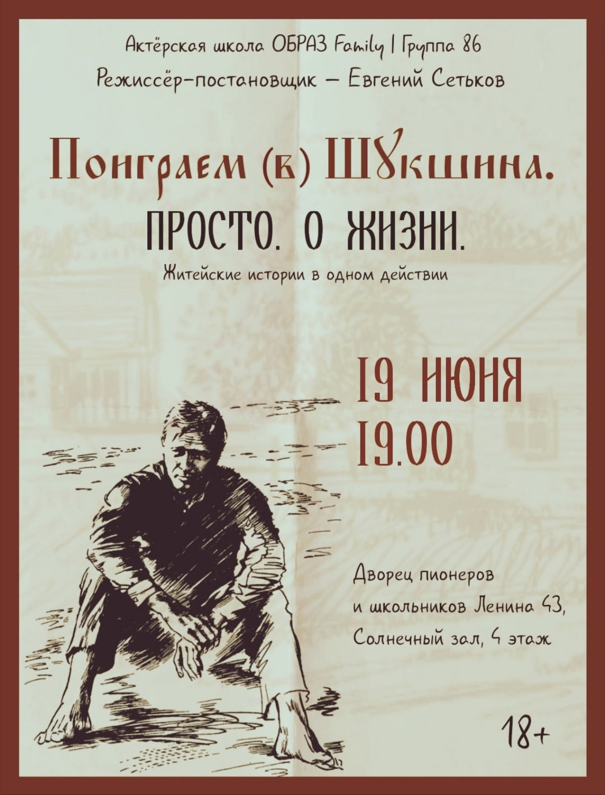 9 июня на сцене Дворца пионеров и школьников пройдет спектакль «Поиграем в Шукшина. Просто о жизни» по рассказам советского классика Василия Шукшина в постановке Евгения Сетькова!