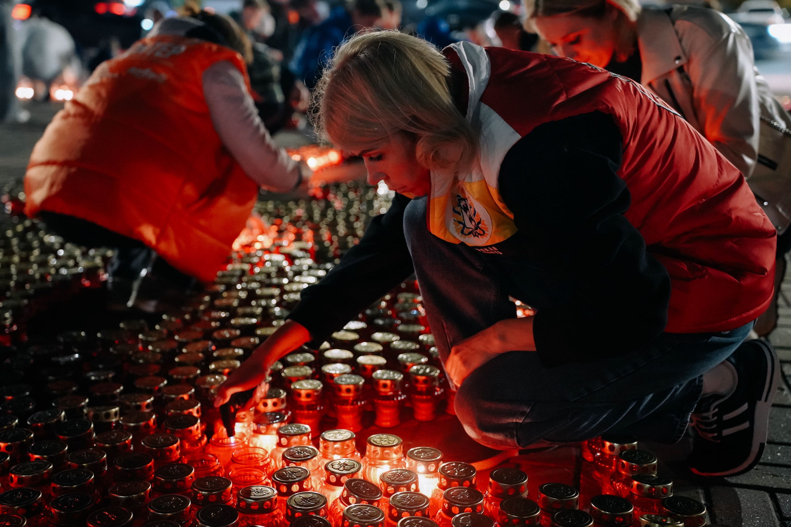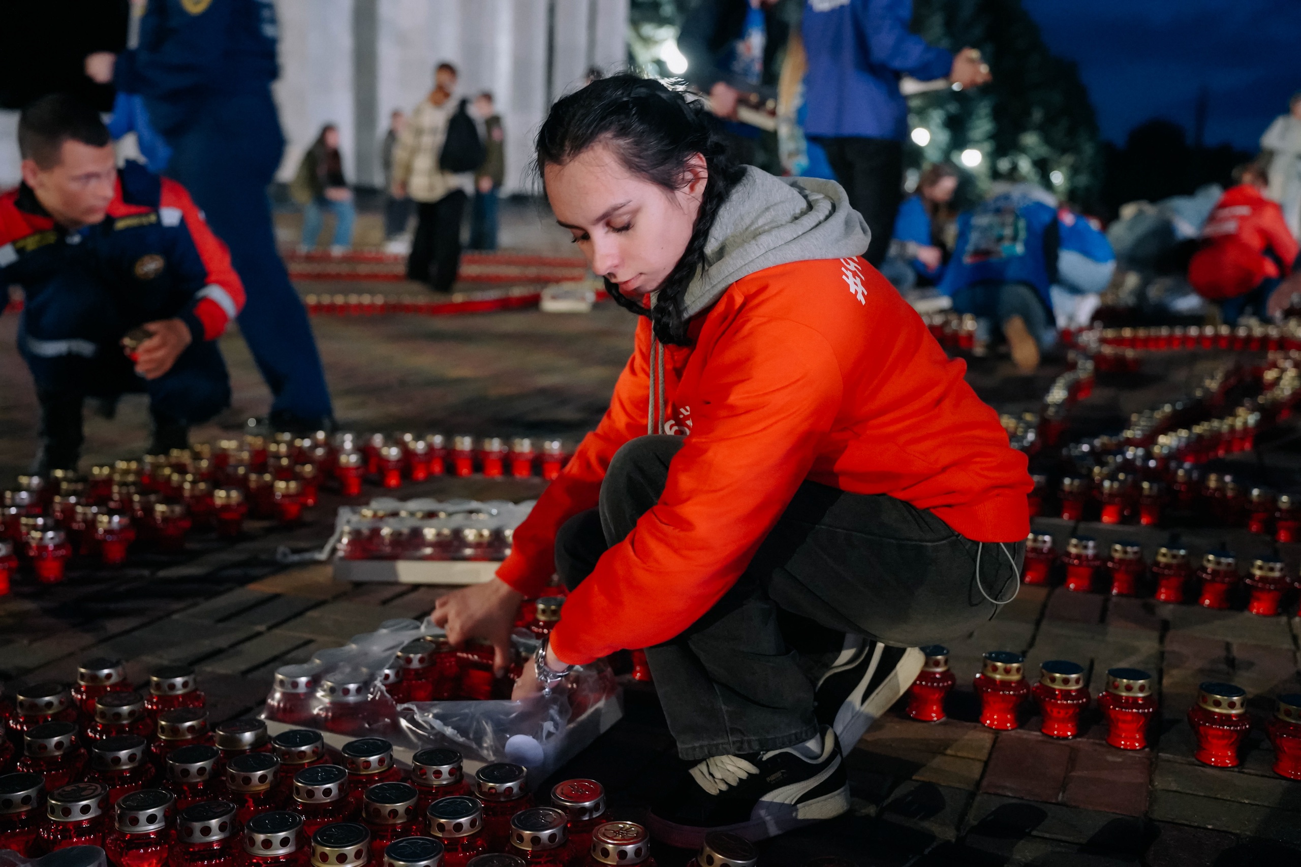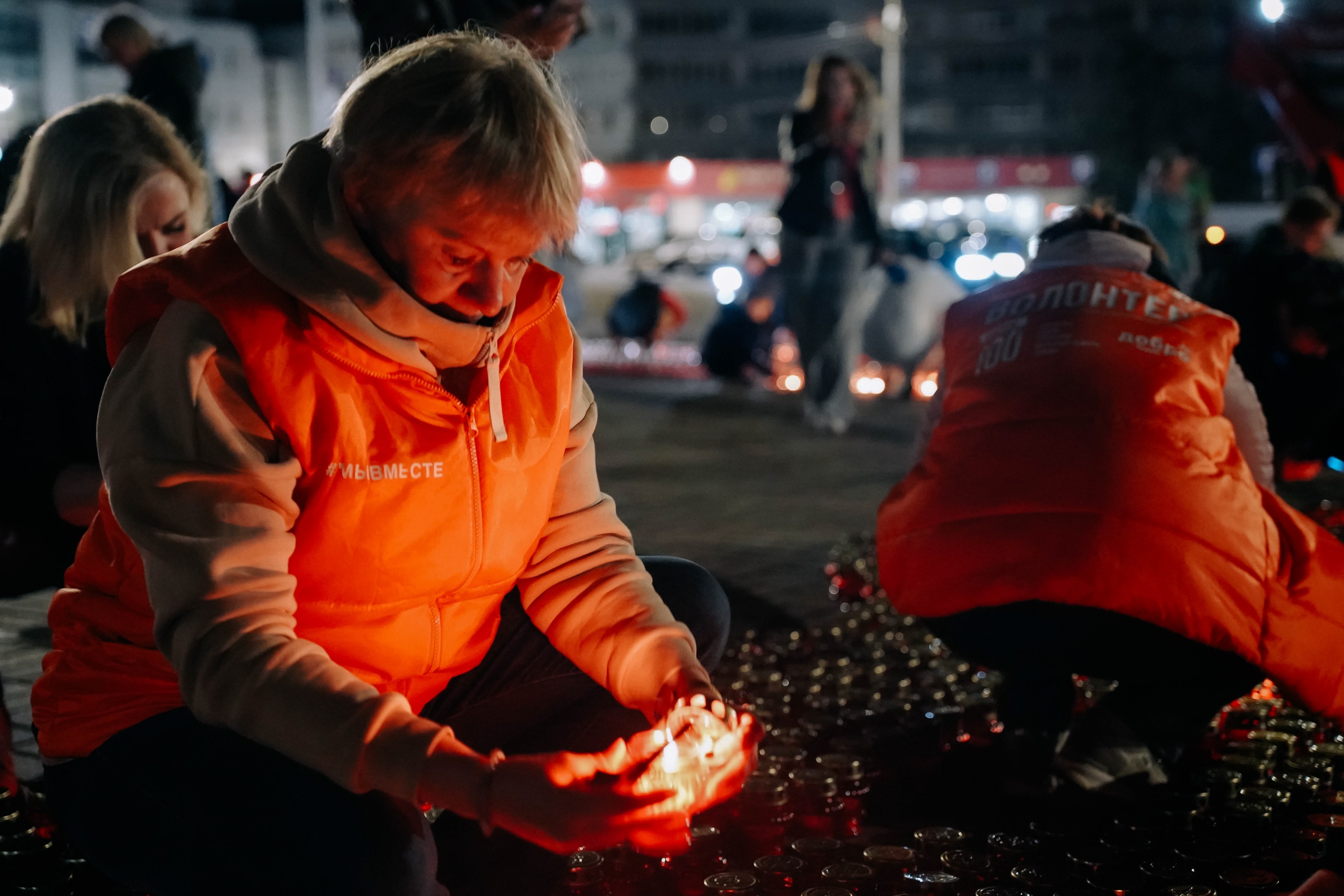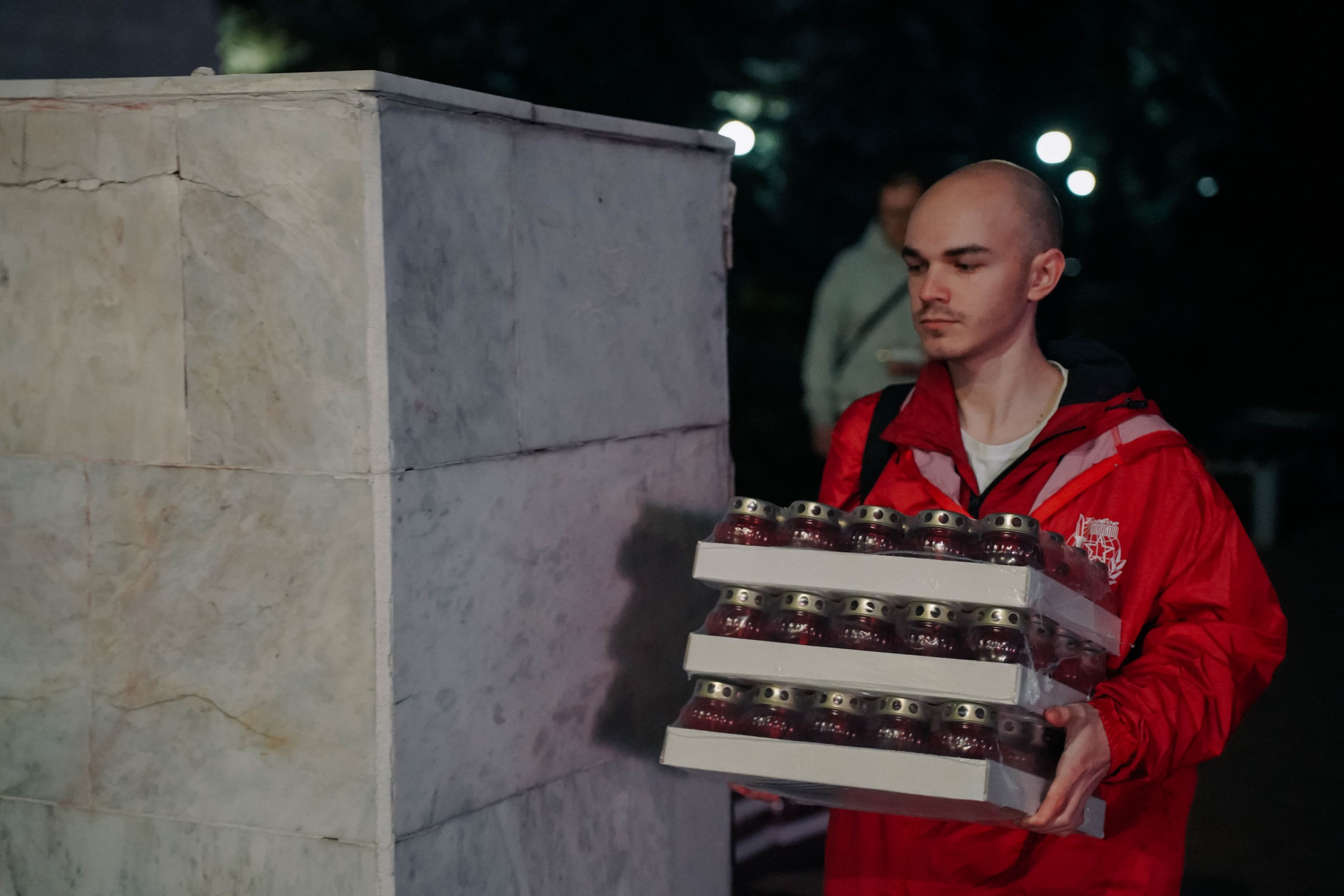 Представители общественных и детских общественных организаций, сотрудники Дворца молодежи и Волонтеры Победы выстроили картину из свечей.