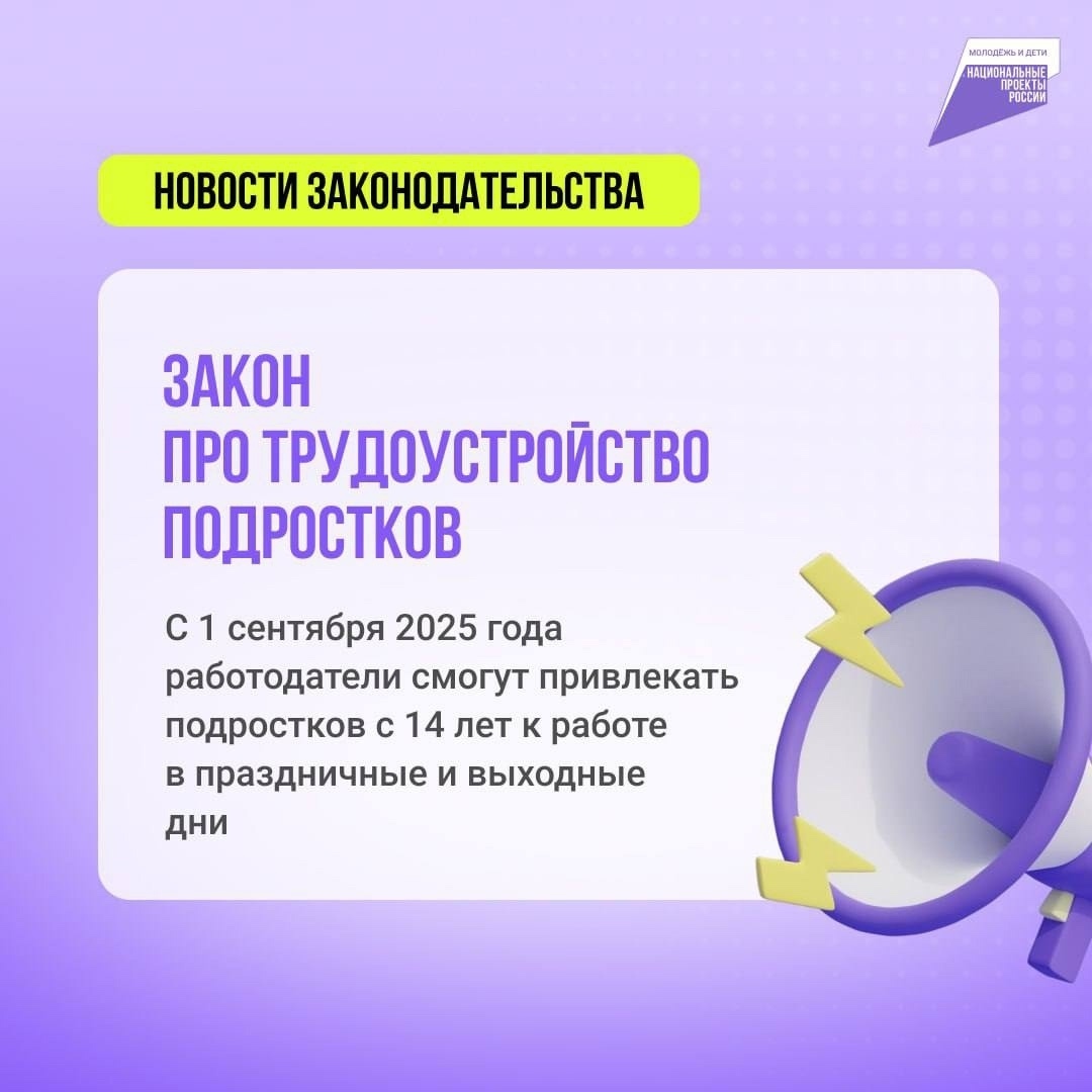 С 1 сентября 2025 года у ребят от 14 до 18 лет появится больше возможностей для трудоустройства в летние каникулы! Теперь можно будет работать в праздничные и выходные дни, но с важными условиями: