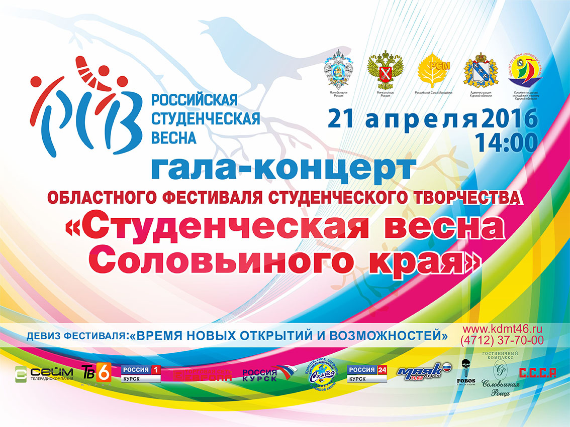 21 апреля 2016 года в 14:00 в ОБУ «Областной Дворец молодежи» (ул. Белгородская, 14Б) с участием Губернатора Курской области А.Н. Михайлова состоится Гала-концерт и торжественная церемония награждения победителей областного фестиваля студенческого творчества «Студенческая весна Соловьиного края».