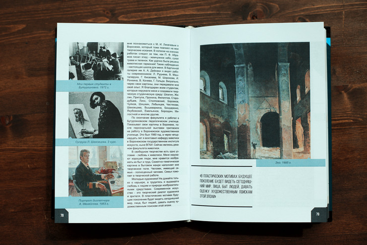 Идея начала зарождаться уже давно, еще с первых лет обучения на худграфе Скобликовой Светланы. Она и стала впоследствии вдохновителем всей команды, которую собрала для совместной работы над книгой. «Мне всегда было интересно слушать, и, думаю, не только мне одной, занимательные случаи из жизни наших творческих наставников. В юном возрасте, впитывая все, как губка, хочется понять, как вырастают настоящие художники, с чего начинается их долгий творческий путь. В 2014 году идея окончательно созрела, была собрана команда активных ребят, закипела работа. Общались с художниками про их молодость, первый опыт в творчестве, рассматривали старые фотографии. Мы не предполагали, что выйдет настоящая книга, планировали простой буклет. Только с каждым новым интервью мы понимали, что дело все намного серьезнее… К лету мы ускорили темп, порою ходили в гости к художникам чуть ли не каждый день! К некоторым совершали выезды в область, с кем-то общались по скайпу, преодолевая часовые пояса. А потом долгие часы расшифровки записей и приведение их в наглядный вид… Мы сохранили авторский стиль повествования каждого выпускника для стирания границ между читателем и художником, чтобы создавалось впечатление прямого общения с персоной. Все тексты со студенческими фотографиями и творческими работами наших героев отдавались после небольшой корректуры наших филологов дизайнеру, и дело шло за версткой книги. А потом целый год мы решали материальный вопрос, поэтому книга вышла в свет только в 2016 году. Тираж небольшой – 100 экземпляров под заказ, почти все книги уже разошлись. Сейчас вспоминаем ту сложную, но безумную пору работы над книгой, и не верим, как мы смогли довести все до конца! В нас тоже верили не все… Но мы смогли! Так в книге около 80 творческих персон, вышедших из стен худграфа, ныне живущих не только в Курске, но и в Москве, Польше, Америке. Общение с ними – бесценный опыт для нас, который мы переложили в книгу для других».