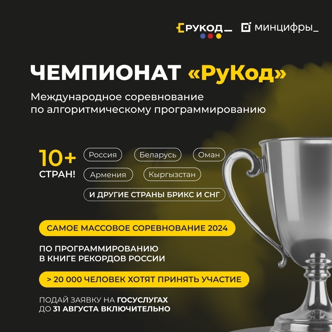 Международный чемпионат «РуКод» проводят 37 ведущих российских и 10 иностранных вузов и организаций в партнёрстве с Минцифры РФ. Проверяй на сайте, возможно, среди них есть твой любимый универ! vk.cc/cNjLNF